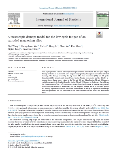 博士生王子仪在塑性力学领域顶刊《International Journal of Plasticity》上发表了题为“A mesoscopic damage model for the low-cycle fatigue of anextruded magnesium alloy”的研究成果。康国政教授为通讯作者,合作者包括于超教授、吴圣川研究员、清华大学航天航空学院冯西桥教授、新加坡南洋理工大学周琨教授、北京大学工学院李航博士后和麻豆做爱