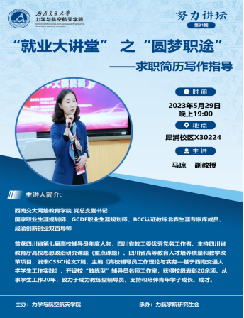 马琼老师以“简而有力”为主题,围绕力航研究生的简历制作,基于HR的视角,从简历的架构、简历的内在逻辑、个人简历基本信息等方面展开了详细的讲解,并结合学院学生的简历做了案例分析。
