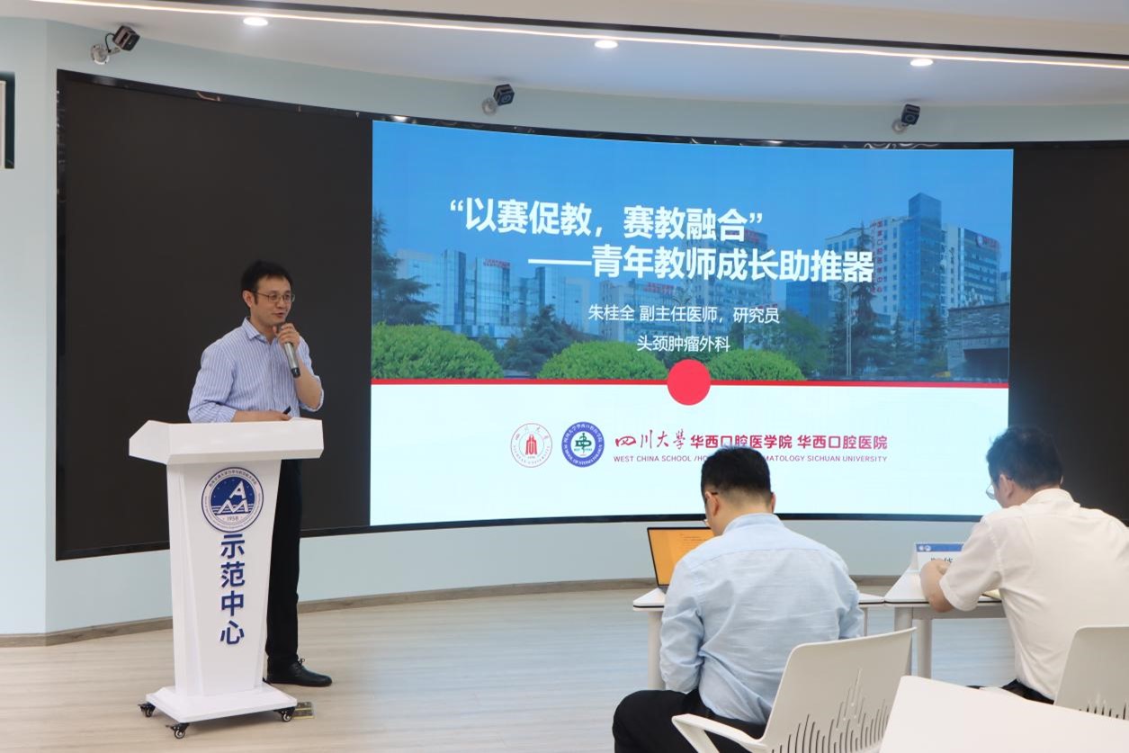 全国高校青年教师教学竞赛医科组一等奖获得者、四川大学华西口腔医院朱桂全研究员带来了题为“以赛促教赛教融合——青年教师成长助推器”的第一场报告。他分享了自己从“教无定法”、“教需有物”、“教有思想”到“教有理论”的逐步提升过程:2020年刚开始接触教学时,自己关注的是互动、气氛、教具模型;2022年参加校赛、省赛时,关注重点转向教学内容的“两性一度”;2023年进入国赛后,关注点开始聚焦于教学核心价值是什么,并运用多种教学方法把核心思想融入内容。他鼓励青年老师们积极参与教学类比赛,从而能够快速提升自己的教学能力。