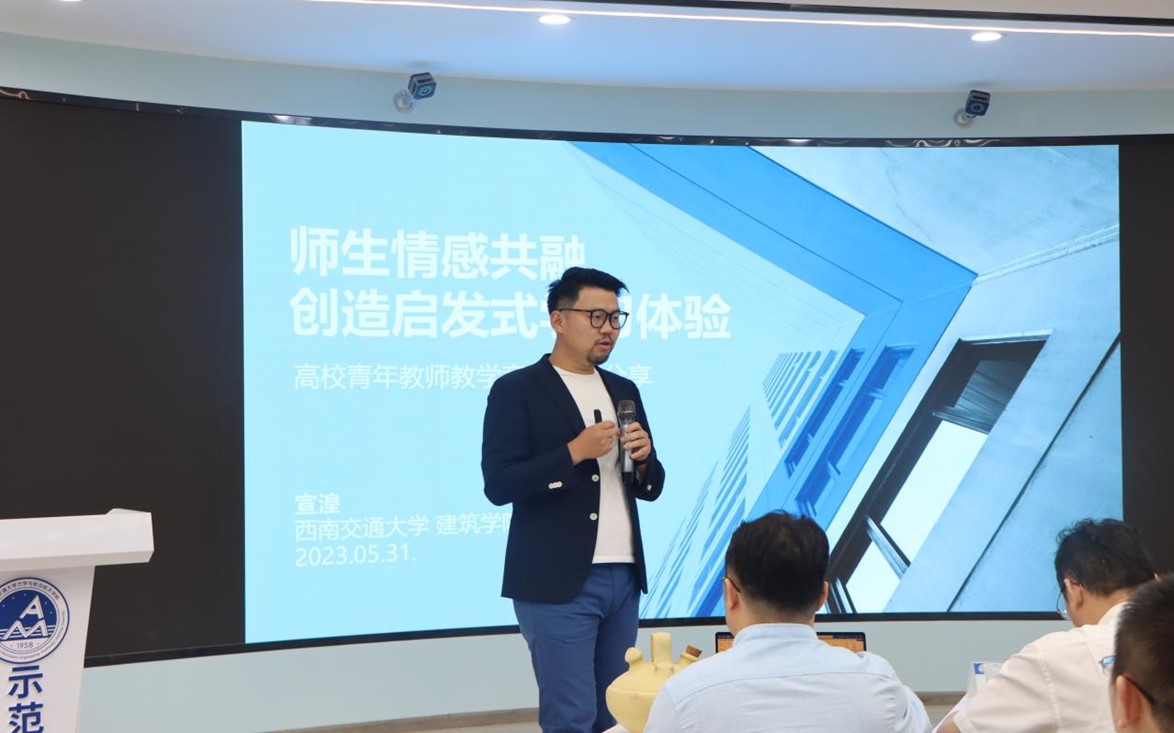 建筑学院宣湟副教授带来第二场报告,题为“师生情感共融,创造启发式学习体验”。他从“为什么”、“是什么”、“怎么做”三个方面介绍了自己对青教赛的认识和体会,详细介绍了自己主讲的《绿色建筑学概论》的教学设计和教学开展情况。他认为,教学重在积累,比赛重在参与,只有真正对这个单位、对学生、对教育有责任心的人,才会坚持不懈地投入,每次用心的付出一定会有回报。