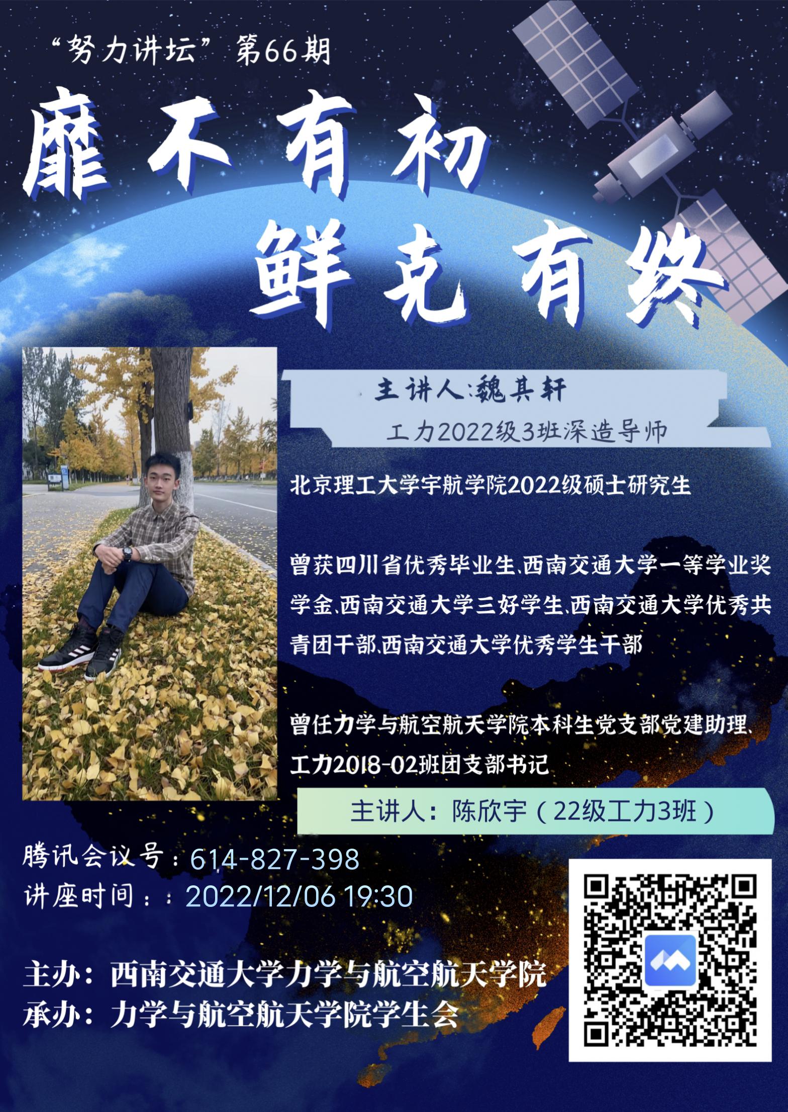 为鼓励广大学生积极向优秀学生看齐、向榜样学习,学院于2022年12月6日举办第66期“努力讲坛”,由魏其轩主讲。魏其轩是工力2022级3班深造导师,北京理工大学宇航学院2022级硕士研究生。曾获四川省优秀毕业生、麻豆做爱