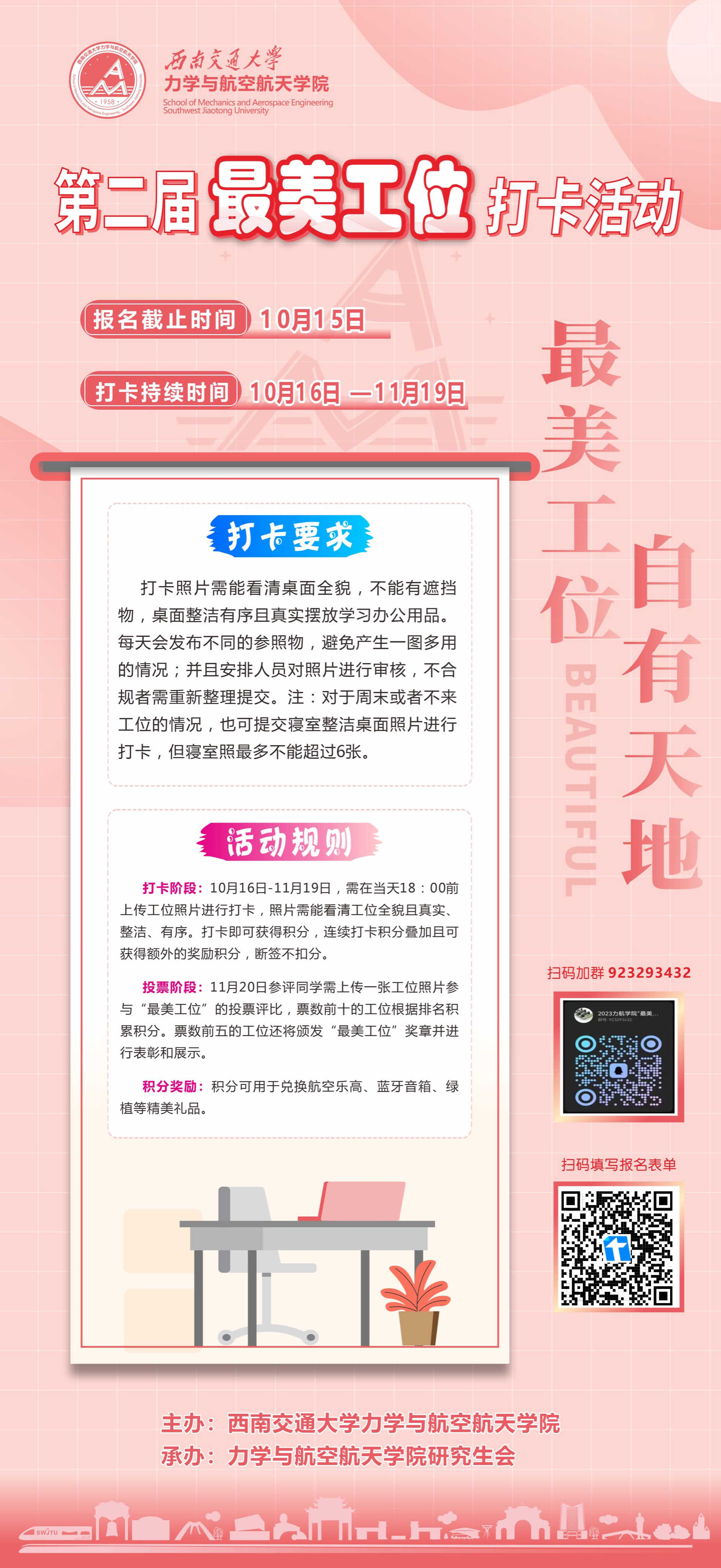 一直致力于营造厚德尚能的学术氛围与环境,而研究生工作室作为广大研究生学术交流和科研生活的主要场所,对建设优良学风发挥重要作用。为提升学院研究生对自己实验室的认同感和归属感;加强工作室文明环境和文化建设,开展卫生、设备、用电等安全教育;同时在研究生中积极开展文明修身活动,引导广大研究生以德修身,培养高尚的道德品质,努力形成“争当文明标兵,共创和谐工作室”的良好风气,特面向全院研究生开展“最美工位”打卡活动。