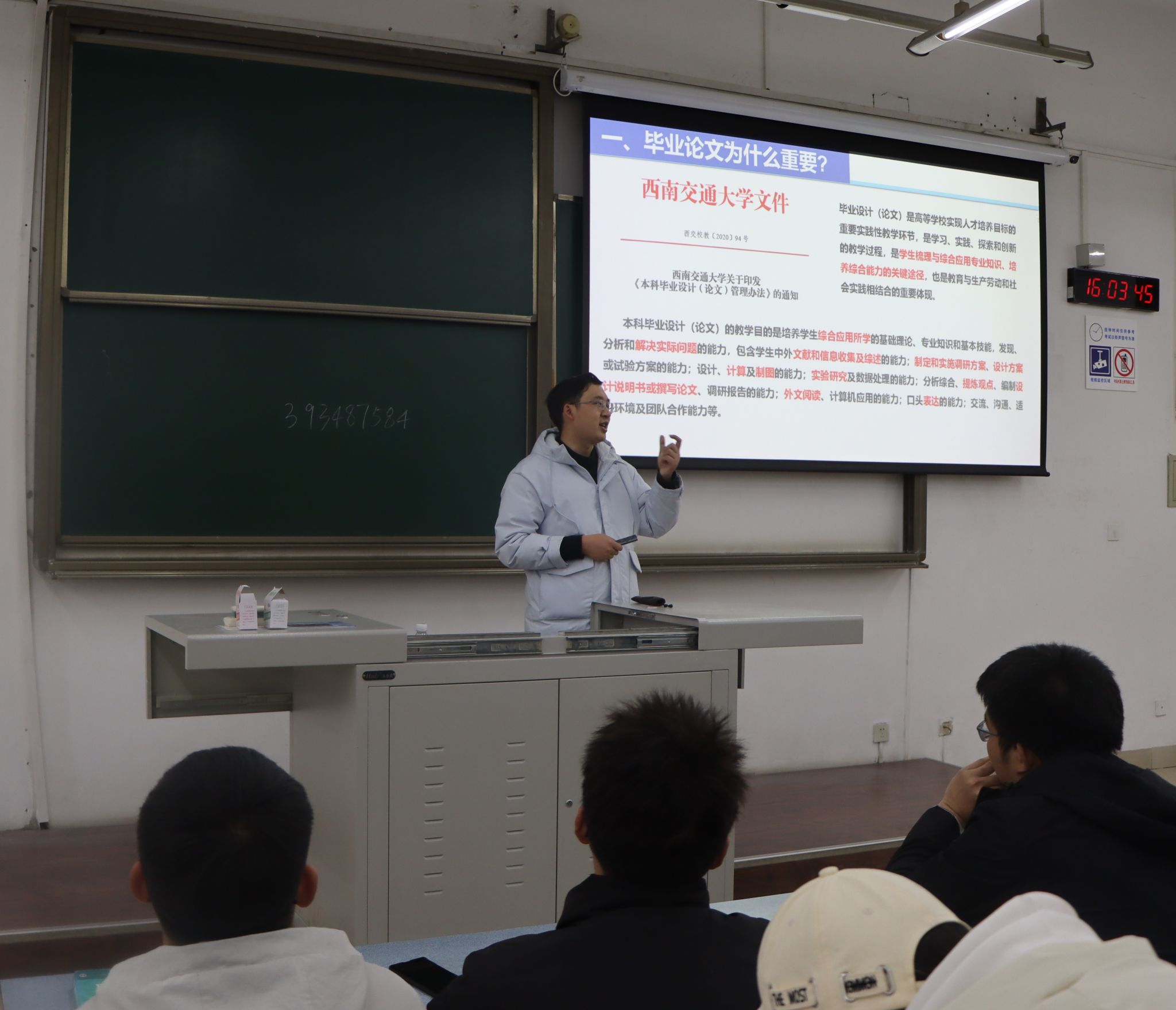 苗鸿臣老师以“2024年本科毕业论文工作规范”为题,围绕毕业论文在人才培养环节中的重要性、时间安排、论文格式及注意事项向同学们进行说明,并以往届优秀毕业生的毕业论文为例,详细讲解了本科毕业论文中常见的格式和内容问题,并希望同学们能够认真对待,以实际行动恪守学院“严谨治学,严格要求”的“双严”传统。