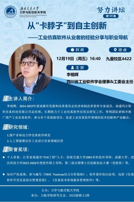 2002级校友、四川省工业软件学会理事、工委会主任李相辉受邀以“从‘卡脖子’到自主创新——工业仿真软件从业者的经验分享与职业导航”为题,在J4422开展努力讲坛第139期讲座。学院党委副书记孔祥彬、2025级研究生参与讲座。讲座由2025级硕士2班班长李秀婷主持。