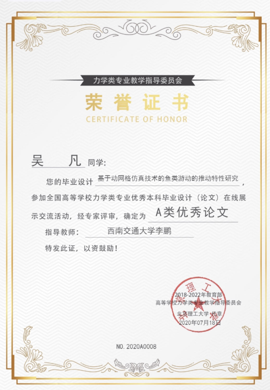 参加评选的两位同学均获奖。其中,吴凡同学的本科毕业论文“基于动网格仿真技术的鱼类游动的推动特性研究”荣获A类优秀论文,熊君媛同学的本科毕业论文“形状记忆合金力学行为的相场模拟”荣获B类优秀论文。他们的指导老师分别为李鹏副教授和康国政教授。