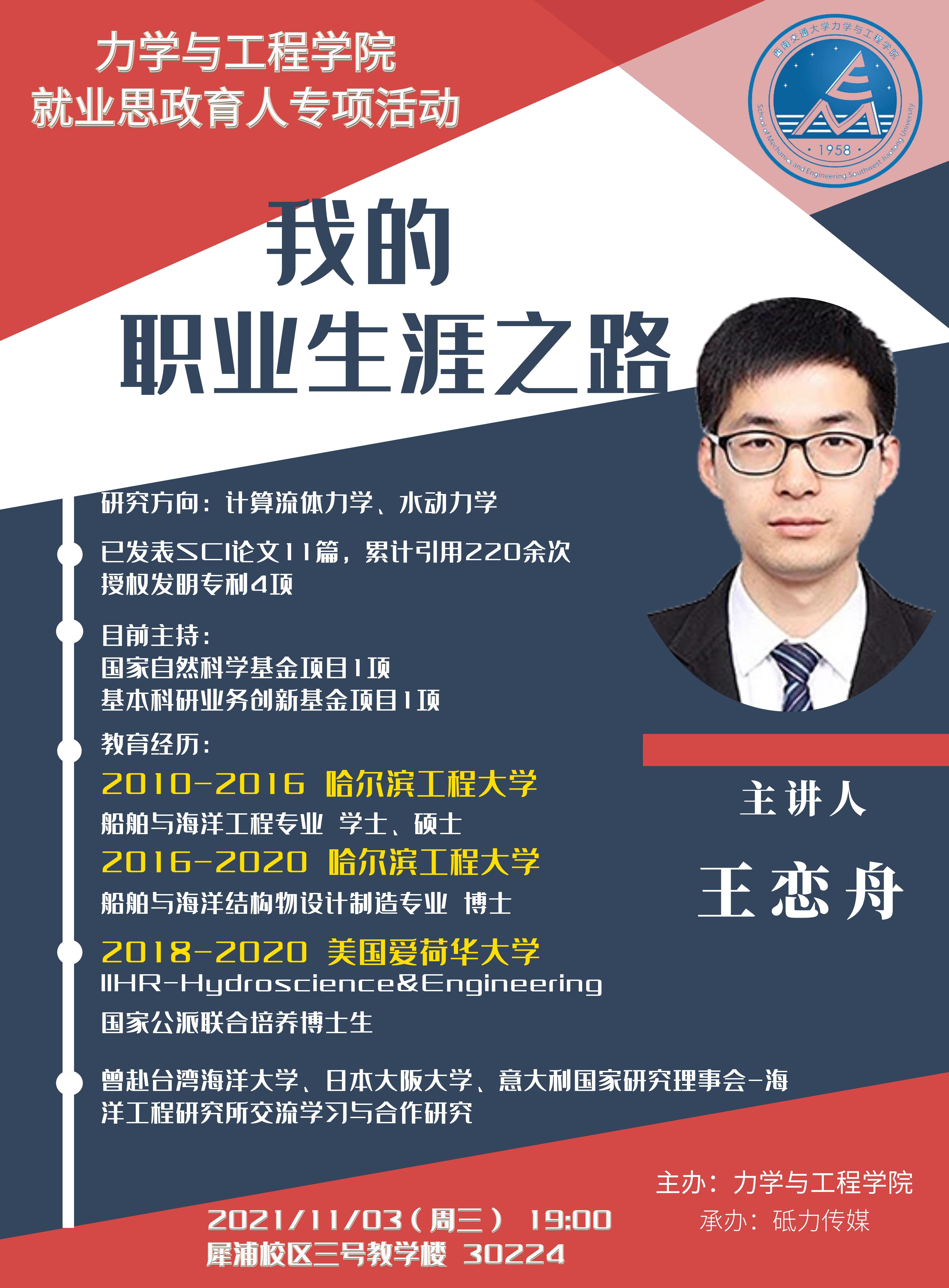 王老师从他的研究课题出发,向同学们介绍了自己的研究课题,分享了读博、海外求学等经历,他表示,力学是一门基础学科、是工科的基础,建议力学的同学们要今早树立继续深造的想法,要认真规划自己的学业,要树立自己的职业理想,积极对接国家交通强国的需求,把自己的追求融入国家的事业中。