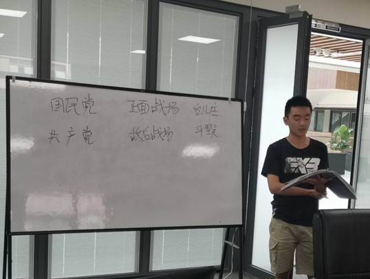 苏欢同学对抗日战争后全面内战相关内容进行了讲述。她以时间轴为主线向大家一一对比了各个时期国民党和共产党总兵力、辖区内人口数量以及经济实力的变化,详细介绍了辽沈战役、淮海战役及平津战役这三大战役,对比分析了中国共产党是如何在硬件实力较为落后的情况下,最终一步步赢得内战的胜利,从而证明马克思主义中国化才是正确的道路。