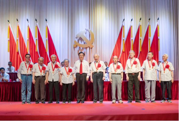 学院退休教师党员江晓仑荣获“光荣在党50年”纪念章,学校党委书记王顺洪为江晓仑老师颁发了纪念章。