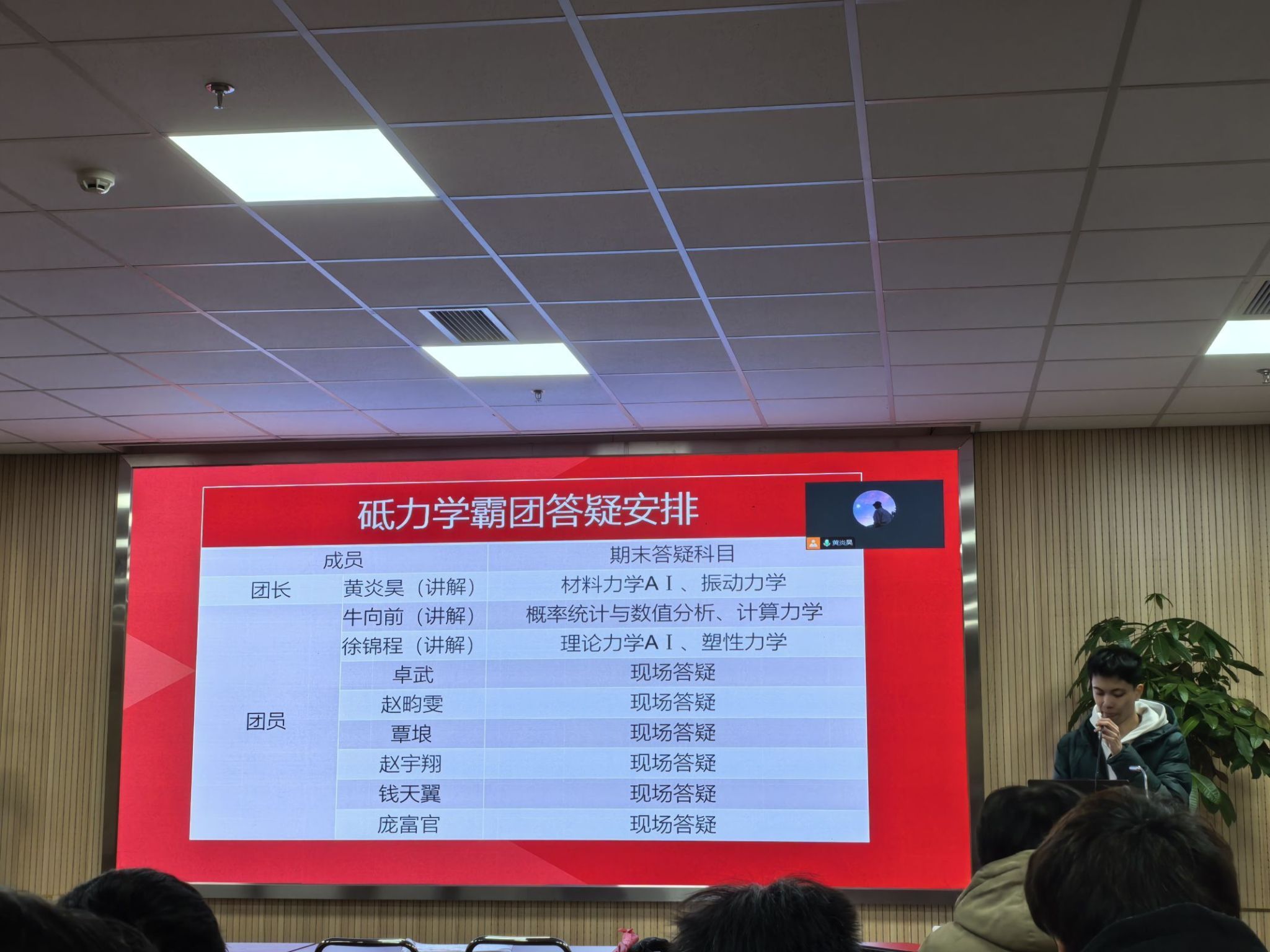 本科生党支部“砥力学霸团”黄炎昊、牛向前、徐锦程、赵昀雯、庞富官、赵宇翔和钱添翼等党员同志,特别邀请今年“竢实扬华奖章”获得者卓武同学共同举办期末考试考前经验分享会。为了方便广大同学参与,经验分享会以线上和线下方式同时开始。学霸团的同志和卓武同学从学习方法、时间管理、考试技巧和具体题目解答等多个方面分享自己的学习经验,无论是线下还是线上的同学都踊跃提问,学霸团和卓武同学都耐心地一一解答,现场气氛热烈而融洽。通过这次活动,广大同学收获了满满的干货,对期末考试有了更充分的准备和更坚定的信心。同时,这也彰显了本科生党支部对同学们学业发展的关心和支持,充分发挥了党员的先锋模范作用和优秀学生的榜样引领作用。