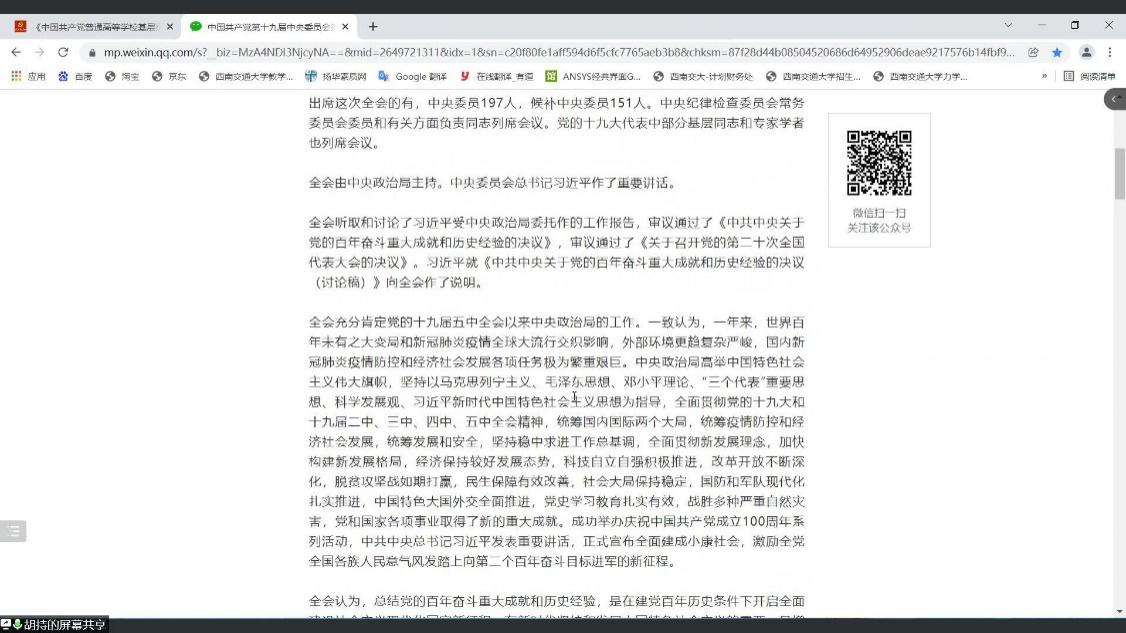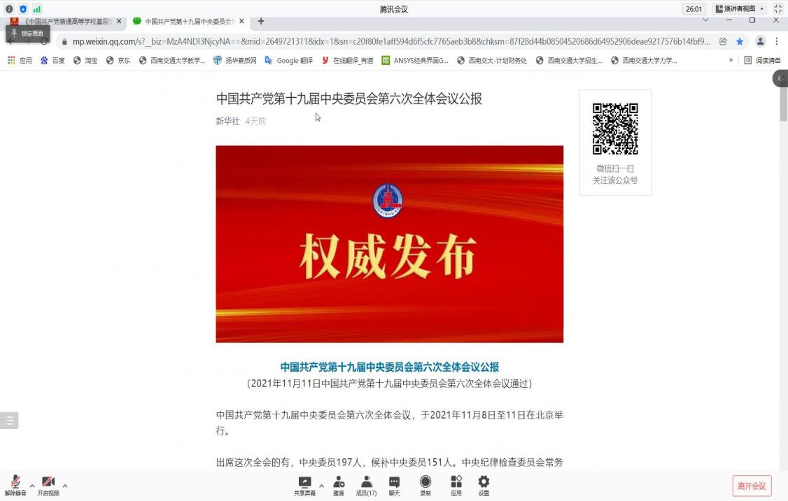 本研联合党支部以线上会议的形式专题学习了《中国共产党第十九届中央委员会第六次全体会议公报》,本次学习由党支部书记胡持领学。