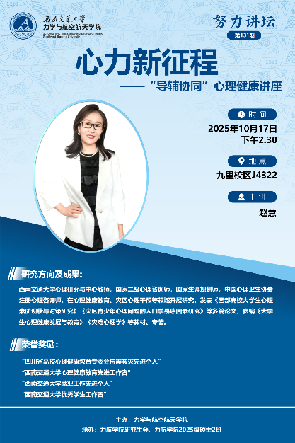 为了更好地关注新生同学的心理状况和心理健康,学院特别邀请心理健康中心的赵慧老师给25级研究生新生做“心力新征程”讲座,帮助同学缓解不安、焦躁、烦恼等不良情绪,提供多种有利于身心健康的方法和手段。