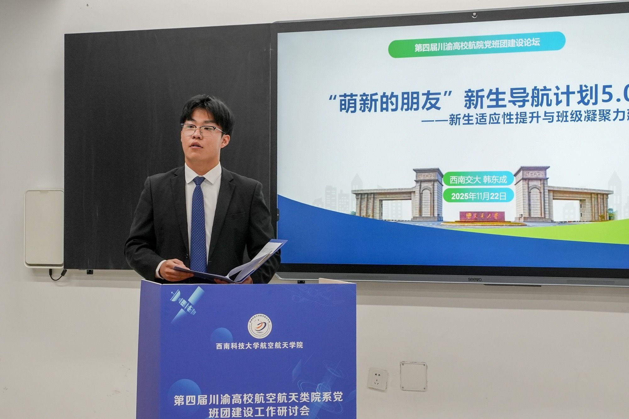 班级联合会主席韩东成在班团建设学生论坛中,做了题为《“萌新的朋友”新生导航计划5.0——新生适应性提升与班级凝聚力建设》的报告,围绕学院 “萌新的朋友” 新生导航计划特色活动进行经验分享与辐射推广。