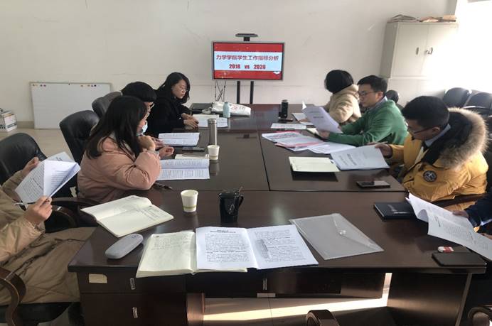 会议最后,孔祥彬副书记对学生工作组2021年重点工作进行部署,主要包括:党员先锋力行动、“双严”学风建设、三因工作、“君子杯”评选活动、力学秘笈第二期编撰、努力讲坛寒假版、砥砺科创营、《大国动力》论文撰写以及2021年课程筹备等工作。相关工作部署后,孔祥彬副书记对2020年学生工作组老师们的辛苦付出表示衷心感谢,并对各位老师祝以新年的问候。