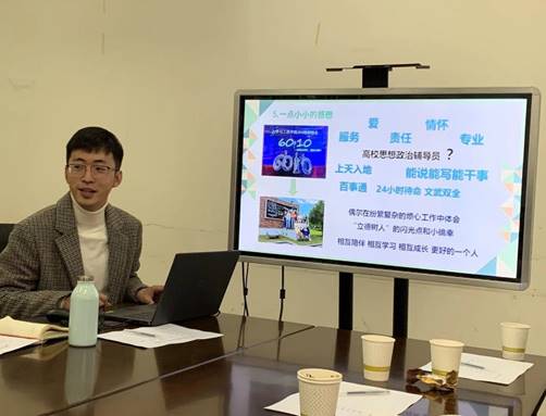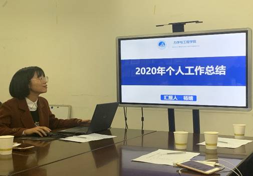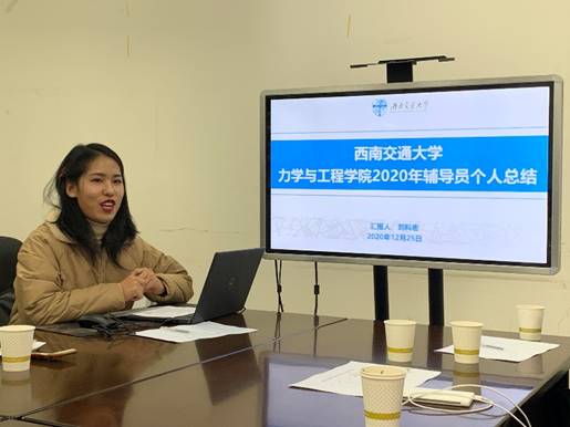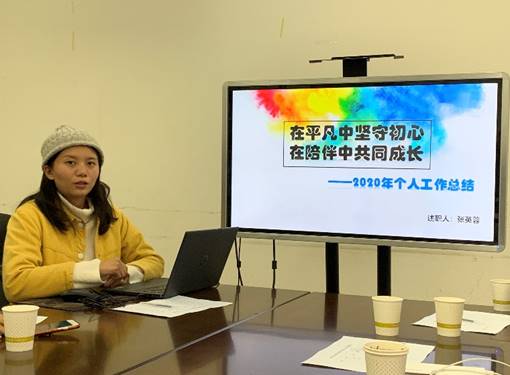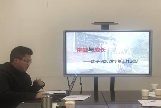 会上,各年级辅导员就2020年工作进行了年终述职:杨婧主要汇报了2019级本科生管理工作、学院学生工作、学院团委工作等;张英蓉以“在平凡中坚守初心,在平凡中陪伴成长”为题,汇报了研究生日常管理、深入学生联系学生以及党建等工作;张容华以“传承‘双严’传统、助力学生成长”为题,重点汇报了“双严”学风建设工作;胡持以“努力奋发创学风,力争上游助成才”为题,汇报了学生工作、防疫工作、党团工作等;刘科宏汇报了研究生日常管理和班团建设相关工作;周子涵和黄冠翔则各自汇报了2020级新生工作和专项工作。