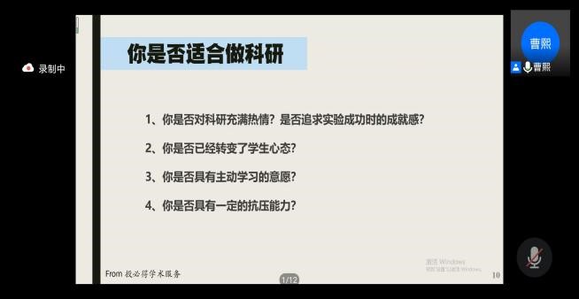 最后,2020级硕士生曹熙为大家解读了科研新人如何入门这一问题。她从“你是否适合做科研”的角度出发,帮助大家深刻地剖析自身,强调科研必须从意识上转变,主动地沉下心进行科研工作。