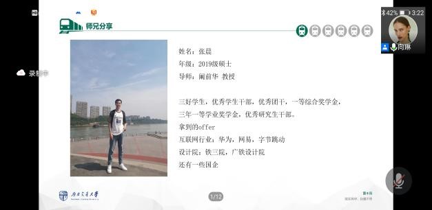 接下来,2019级硕士生张晨分享了自身的求职经历与经验,建议大家将科研学习放在第一位,为以后就业打下基础,同时在求职时不必只拘泥于专业对口的工作,任何感兴趣的就业方向都可大胆尝试。