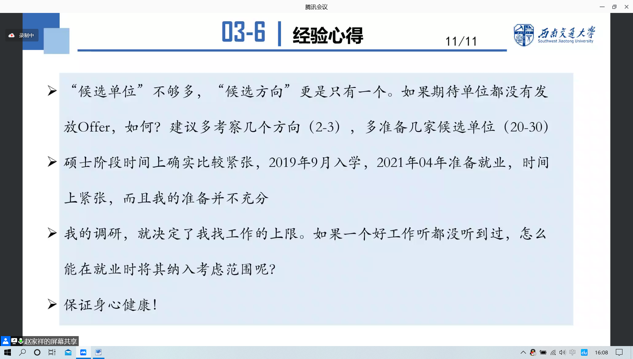 接着,2019级硕士生赵家祥从科研和就业两方面进行了经验分享。他认为,科研重要的是要主动和保持良好的心态,就业则应当多做调研,扩大将来的择业范围。
