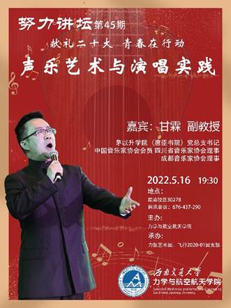 5月16日19:30,茅以升学院(唐臣书院)党总支书记甘霖老师受邀做客“努力讲坛”第45期,讲座主题为“声乐艺术与演唱实践”。本次讲座由力航艺术团、飞行2020-01团支部承办,采用线下与线上直播同时进行的方式。麻豆做爱