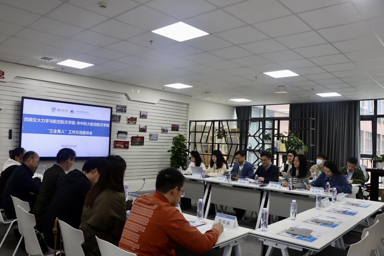 上午,华中科技大学一行与麻豆做爱 师生进行“三全育人”工作交流座谈。宋建涛、阚前华分别介绍本院发展概况、教育教学、科学研究等。孔祥彬就学院“三全育人”工作进行了详细汇报。宋建涛、王琳对麻豆做爱 人才培养工作给予高度评价,认为西南交大麻豆做爱 在“三全育人”工作中形成了很多行之有效的工作方法和模式,非常值得借鉴。